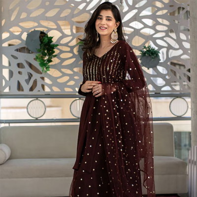 Brown & Gold-Toned Embellished Semi-Stitched Dress Material