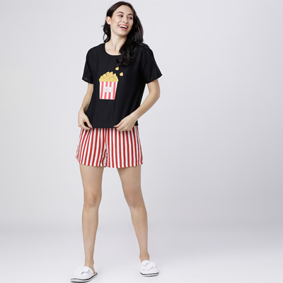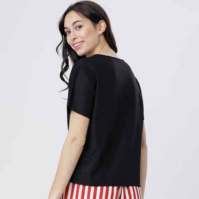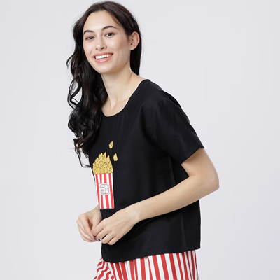 "Black and Red printed lounge top, has a round neck and short sleeves