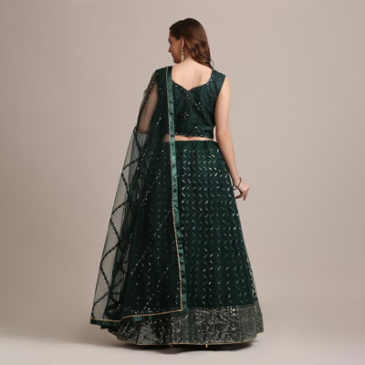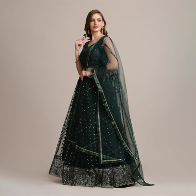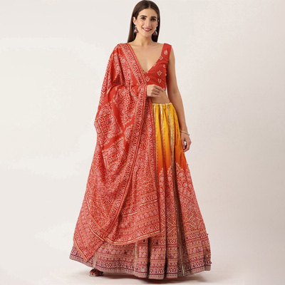 "Lehenga Fabric : Raw Silk Blouse Fabric : Raw Silk Dupatta Fabric : Net Lehenga Lining Fabric : Shantoon Hemline : Flared Neck : Round Neck Sleeve Length : Short Sleeves Sleeve Styling : Regular Sleeves"