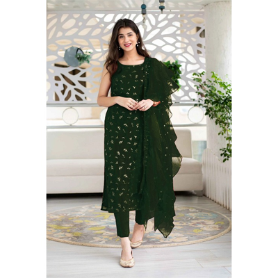 "Green embroidered semi-stitched dress material Green embroidered kurta fabric Green solid bottom fabric Green embroidered dupatta, has Disclaimer: Images are for referral purposes only. The actual product is semi-stitched Size & Fit Top fabric length: Bottom fabric length: Dupatta length: 2 metres (approx) Material & Care Top Fabric : Fox Georgette Bottom Fabric : Creap Duptta Fabric : Net Inner Fabric : Creap Wash Care: Dry clean for the first wash, there after hand wash"