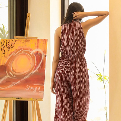 "Maroon and white printed basic jumpsuit ,has a round neck, sleeveless, 2 pockets