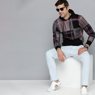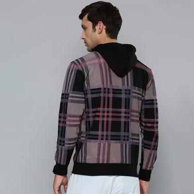 "Black checked sweatshirt has a hood, 1 kangaroo pocket, long sleeves, ribbed hem