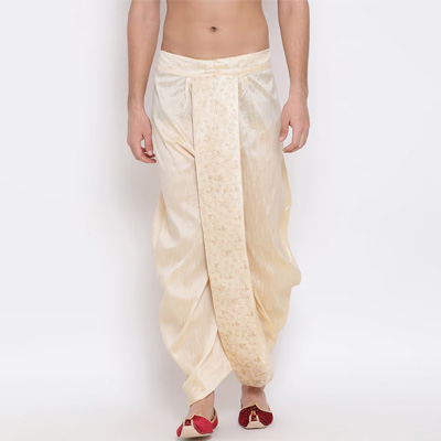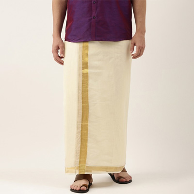 "Pack of 2 dhoti Green solid dhoti has gold zari border Beige solid dhoti has gold zari border Size & Fit Dimension of dhoti: 1.27 m x 2 m(Length x Width) Material & Care 100%Cotton Machine wash"