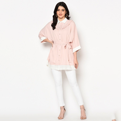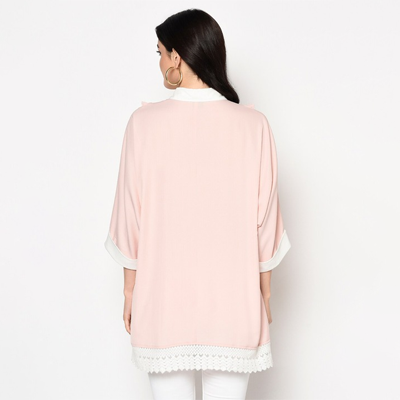"Pink and white solid tunic ,has a shirt collar, three-quarter sleeves, button closure