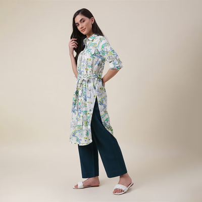 "Printed tunic ,has a shirt collar, long sleeves, button closure