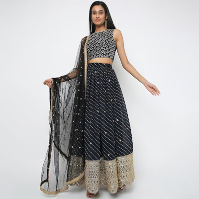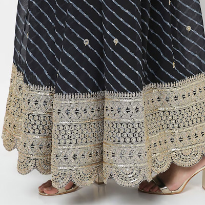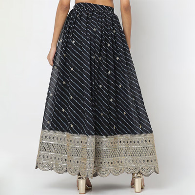 "Navy Blue-coloured striped Embroidered Maxi flared skirt has an elasticated waistband with a side zipper closure, flared hem Size & Fit The model (height 5'8"") is wearing a size 26 Material & Care Poly Georgette Hand Wash"