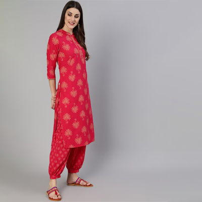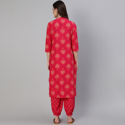 "Sleeve Length : Three-Quarter Sleeves Top Shape : Straight Top Type : Kurti Bottom Type : Salwar Top Pattern : Printed Top Design Styling : Regular Top Hemline : Curved Top Length : Calf Length"