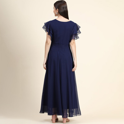 "Navy Blue embroidered maxi gown dress, has a round neck, short sleeves, and flared hem