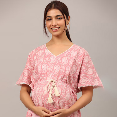 "Colour: pink Paisley printed V-neck Short, flared sleeves Anarkali shape with empire style Knee length with flared hem Machine weave regular cotton Size & Fit The model (height 5'8) is wearing a size S Material & Care 100% Cotton Machine Wash"
