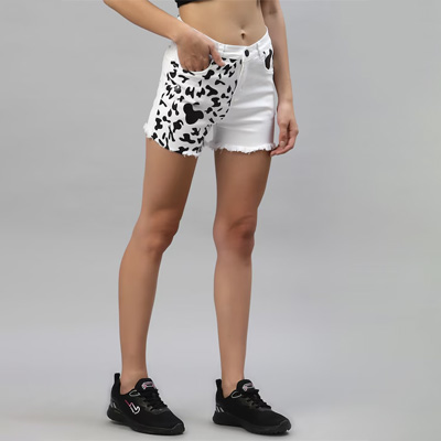 "White abstract printed high-rise outdoor hot pants, has 4 pockets, button closure Size & Fit Slim Fit The model (height 5'8) is wearing a size 28 Material & Care denim machine wash Wash dark colour separately do not bleach warm iron if needed"